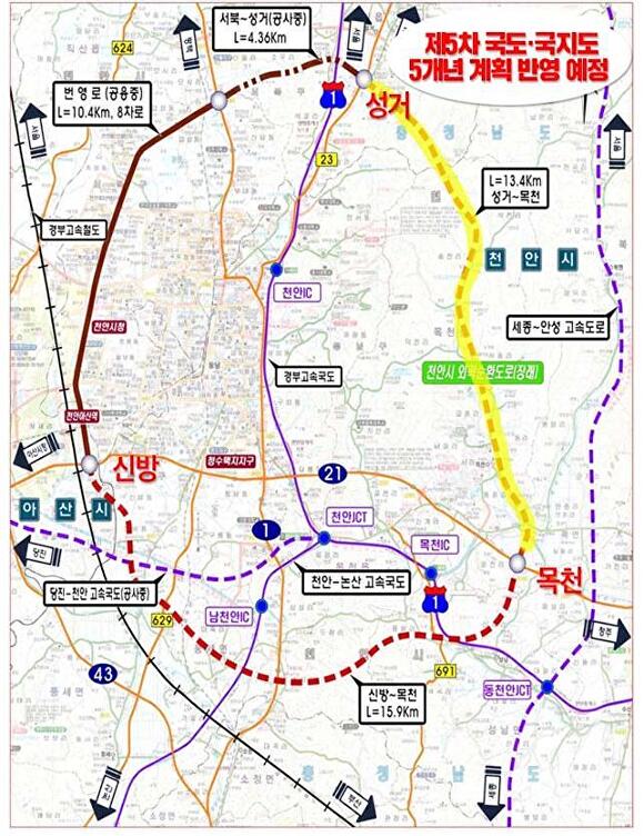 우선 ‘천안 성거~목천 우회도로 신설’ 사업은 천안시 외곽순환도로망 건설의 시작으로 길이 12.88km를 폭 4차로로 신설하며 사업비 약 5천365억원이 투입된다. 추가 계획 중인 ‘천안 신방~목천 우회도로 신설’ 사업(길이 15.48km, 폭 4차로, 사업비 6천240억)과 연결해 천안시 최초의 외곽순환도로망이 구축 될 것으로 기대를 모으고 있다.