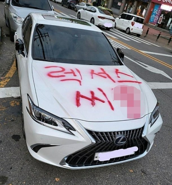최근 한 온라인 커뮤니티에 별다른 설명 없이 '주차를 잘하자'는 제목으로 공개된 사진에는 렉서스 차량이 법규를 어기고 불법 주차한 모습이 담겼다. 렉서스 차량의 보닛에는 "렉서스 씨X"이라는 욕설이 보닛의 전면을 가득 채울만한 크기로 적혀있다.