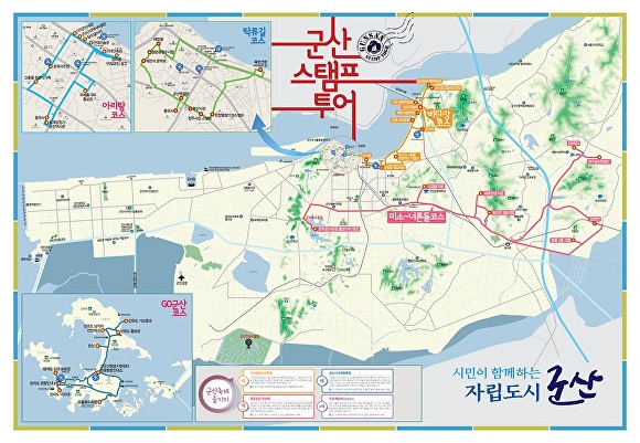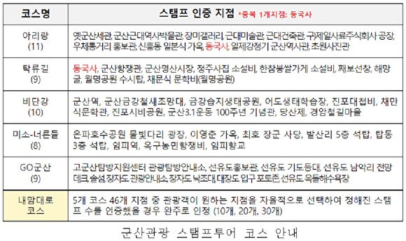 군산 스탬프투어는 시의 다양한 관광 명소를 방문, 스탬프를 찍고 기념품을 수령 하는 현장 체험형의 관광 프로그램이다. 총 5개 코스 46개 지점으로 구성됐으며, 코스별 테마를 부여해 군산 관광의 또 다른 재미를 느낄 수 있도록 했다.