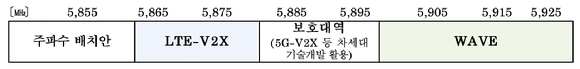 C-ITS로 공급한 70㎒폭(5천855∼5천925㎒) 중 하위 20㎒폭은 LTE-V2X로, 상위 30㎒폭은 WAVE로 분배한다. 또한 잔여 20㎒폭은 보호대역으로 설정하되 5G-V2X 등 차세대 C-ITS 기술개발 등에 활용할 수 있도록 할 방침이다.