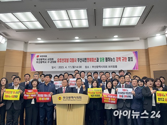 안성민 부산광역시의회 의장을 비롯한 국민의힘 시의원 40명과 군의원 6명은 17일 오후 부산시의회 브리핑룸에서 기자회견을 열고 “친일몰이로 일광읍과 기장군민의 명예를 훼손한 유튜브 ‘더탐사’는 당장 사과하라”고 촉구했다.