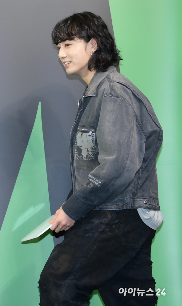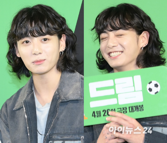 이날 정국은 빈티지한 느낌의 데님 재킷과 와이드한 벌룬팬츠로 힙한 패션을 착용하고 귀여운 단발펌 헤어스타일을 매치해 눈길을 끌었다.