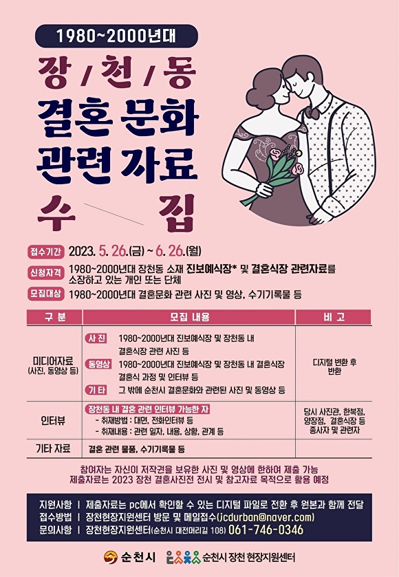 시는 1980년에서 2000년대의 장천동 소재 진보예식장을 비롯해 옛 순천의 결혼식장과 관련된 사진과 영상 자료를 모집하며, 해당 자료의 저작권을 보유한 개인·단체 등 누구든지 참여가 가능하다.