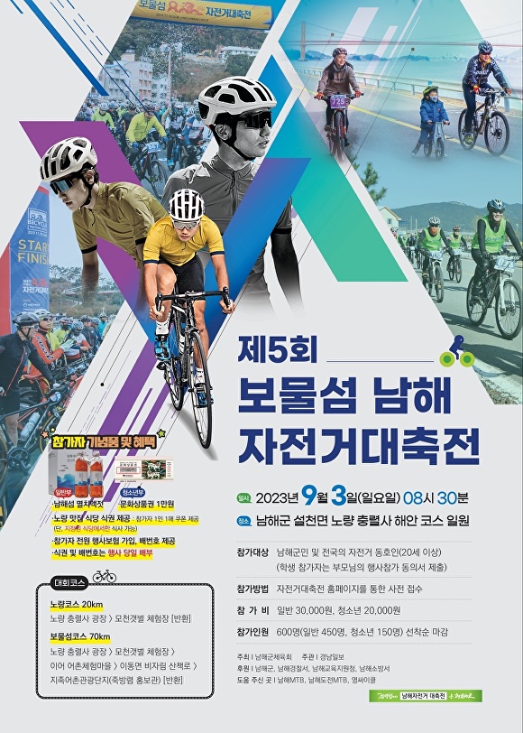 [아이뉴스24 이상욱 기자] 경상남도 남해군은 해안도로를 따라 펼쳐지는 ‘제5회 보물섬 남해 자전거대축전’이 오는 9월 3일 남해군 설천면 노량마을 일원에서 개최된다고 19일 밝혔다.