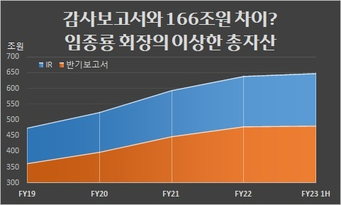 [아이뉴스24 김병수 기자] 우리금융그룹이 통상적인 개념과 거리가 있는 기업설명활동(IR)을 하는 것으로 나타났다. 다른 금융그룹들과 달리 IR에서 제시한 총자산 규모가 상당히 부풀려져 있다. 무려 166조원 차이다. IR에서 제시한 총자산은 649조원, 회계법인(삼정)의 반기 감사보고서엔 483조원으로 계상됐다.