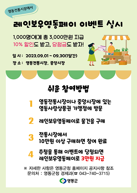영동전통시장과 중앙시장 영동사랑상품권 가맹점 누적 사용액 10만원 이상이면 자동 응모된다. 이벤트 종료 후 추첨을 통해 3만~5만원의 레인보우페이를 지급한다.
