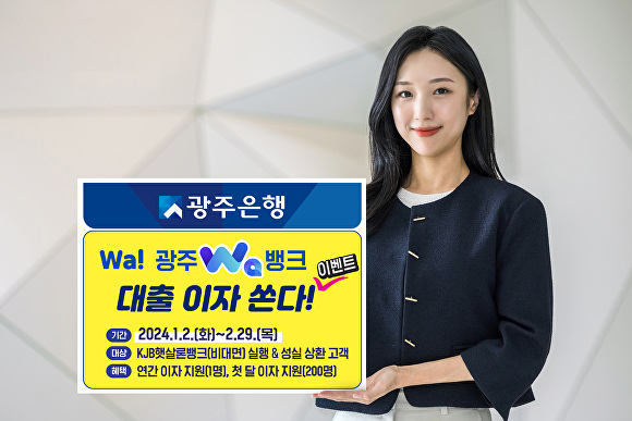 [아이뉴스24 김상진 기자] 광주은행은 갑진년 새해를 맞아 ‘KJB햇살론뱅크(비대면)’ 실행 고객을 대상으로 1년 이자 또는 첫 달 이자 지원 혜택을 제공하는‘Wa! 광주 와뱅크가 대출이자 쏜다’ 이벤트를 진행한다고 3일 밝혔다.
