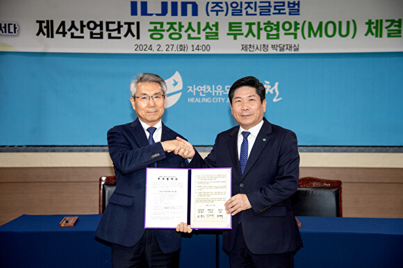 [아이뉴스24 한준성 기자] 충북 제천시는 27일 시청에서 ㈜일진글로벌과 4산업단지 공장 신설 투자협약을 했다고 밝혔다.
