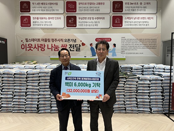 [아이뉴스24 안영록 기자] 충북 청주시 사직3구역 주택재개발 정비사업조합은 6일 어려운 이웃을 위해 써달라며 3200만원 상당의 쌀 600포(6000㎏)를 청주시에 기탁했다. 이 쌀은 힐스테이트 어울림 청주사직 아파트 견본주택을 개관하면서 화환 대신 받은 것이다. 쌀은 푸드마켓을 통해 저소득가정에 지원될 예정이다.