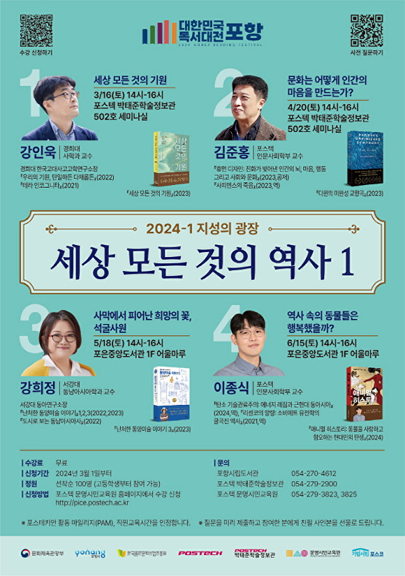 [아이뉴스24 이진우 기자] 경북 포항시는 오는 16일부터 6월 15일까지 매월 셋째 토요일 오후 2시, 2024 제11회 대한민국 독서대전 포항의 연간프로그램인 '세상 모든 것의 역사'를 운영한다고 밝혔다.
