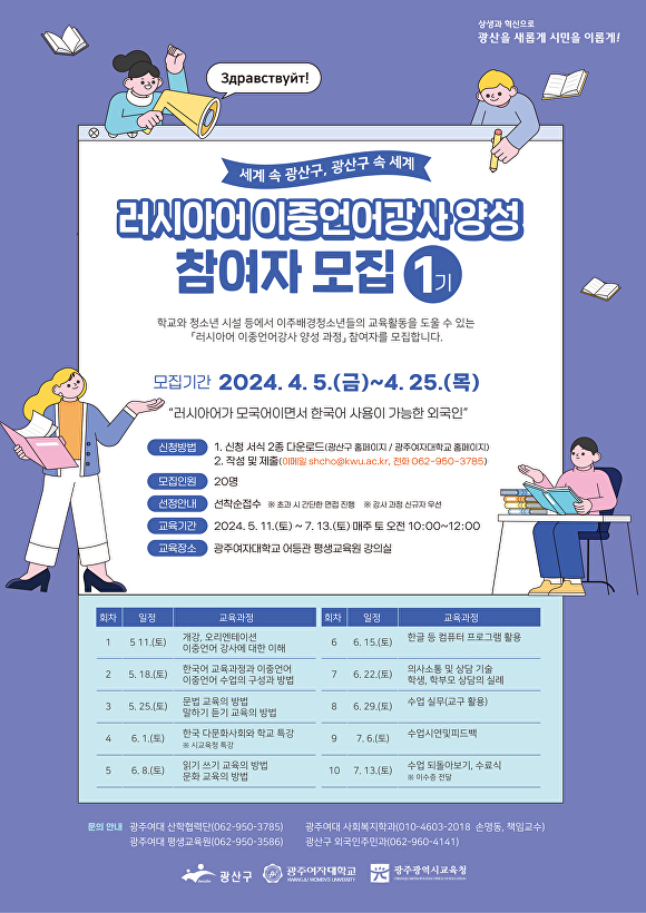 [아이뉴스24 한봉수 기자] 광주광역시 광산구가 러시아어를 모국어로 하고 한국어를 할 줄 아는 외국인을 대상으로 ‘러시아어 이중언어강사 양성’ 과정(이하 과정)을 개설‧운영한다고 3일 밝혔다.
