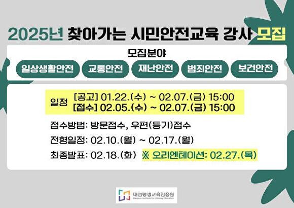 [아이뉴스24 강일 기자] 대전평생교육진흥원은 찾아가는 시민안전교육 강사를 2월 7일까지 모집한다.
