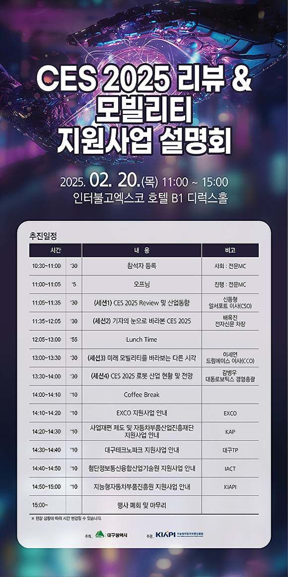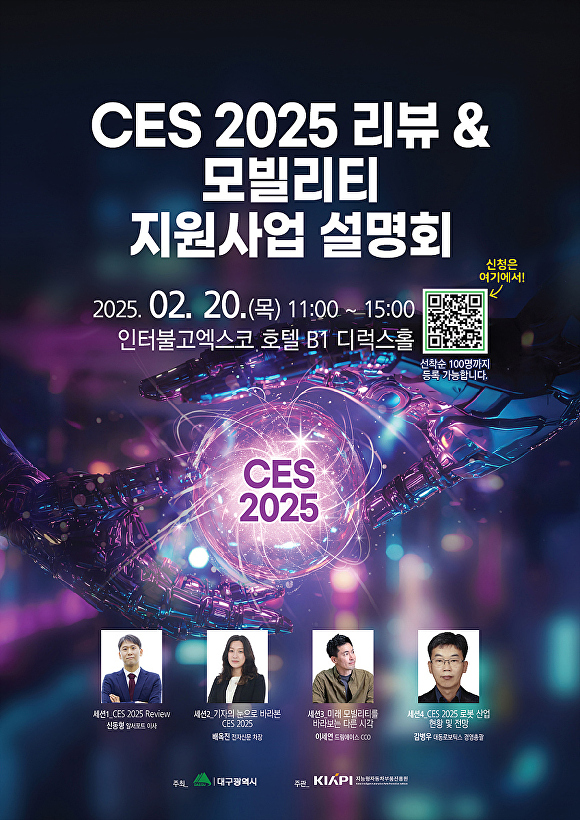 [아이뉴스24 이창재 기자] 대구광역시가 주최하고 (재)지능형자동차부품진흥원이 주관하는 ‘CES 2025 리뷰 & 모빌리티 지원사업 설명회’가 오는 20일 오전 11시 인터불고엑스코 호텔에서 개최된다.