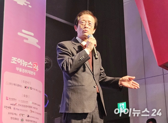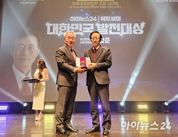 [아이뉴스24 정예진 기자] 이갑준 부산광역시 사하구청장이 지난 27일 개최된 ‘2025년 아이뉴스24·조이뉴스24 부울경취재본부 초청 신년회 및 후원회·자문위원·운영위원 임명장 수여식·시상식’에서 ‘아이뉴스24 대한민국 발전대상’ 복지 분야를 수상하고 있다.