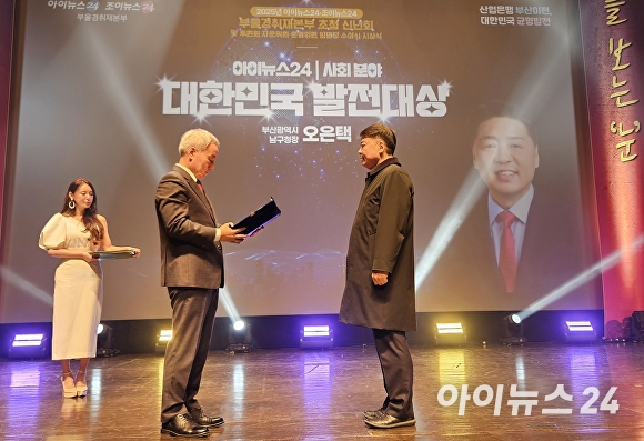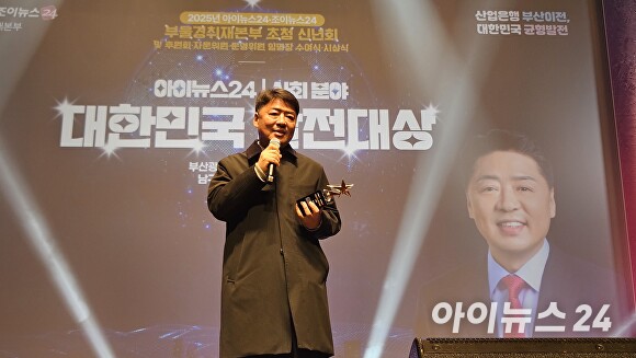 [아이뉴스24 정예진 기자] 오은택 부산광역시 남구청장이 지난 27일 개최된 ‘2025년 아이뉴스24·조이뉴스24 부울경취재본부 초청 신년회 및 후원회·자문위원·운영위원 임명장 수여식·시상식’에서 ‘아이뉴스24 대한민국 발전대상’ 사회 분야를 수상하고 있다.