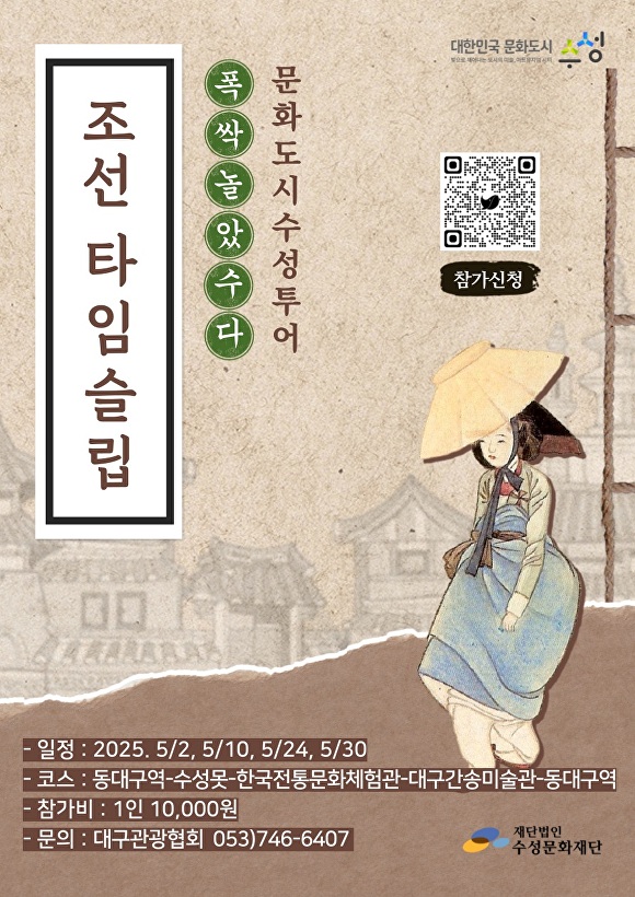 [아이뉴스24 이창재 기자] 대구 수성문화재단(이사장 김대권)은 가정의 달 5월을 맞아 온 가족이 함께 즐길 수 있는 전통문화 테마투어 ‘폭싹 놀았수다. 조선 타임슬립’ 프로그램 참가자를 모집한다고 23일 밝혔다.