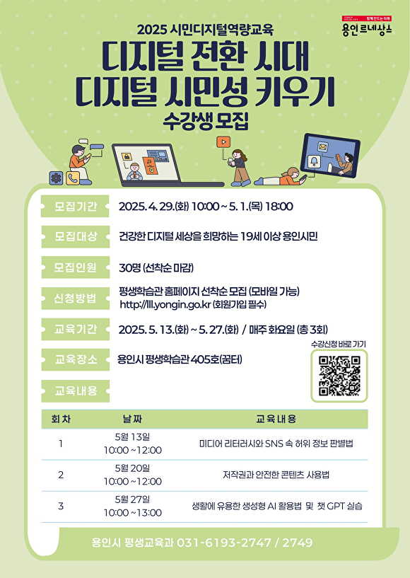 [아이뉴스24 정재수 기자] 경기도 용인특례시는 시민을 대상으로 디지털 활용 능력 향상을 위한 ‘디지털 전환 시대 디지털 시민성 키우기’ 교육을 마련했다고 25일 밝혔다.