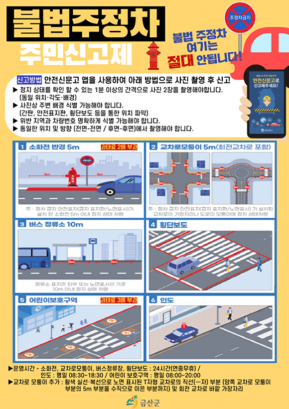 [아이뉴스24 박희석 기자] 충남 금산군은 안전 신문고 앱을 통해 과태료를 부과하는 주민 참여형 공익신고제인 불법 주정차 주민신고제 운용 기준을 일부 변경해 5월 1일부터 시행할 계획이다.