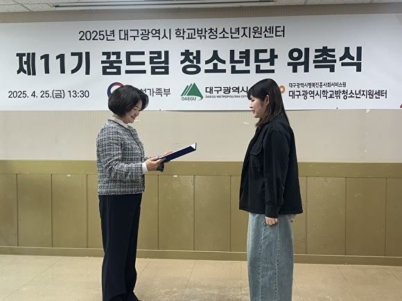 [아이뉴스24 이창재 기자] 대구광역시행복진흥사회서비스원(이사장 배기철, 이하 대구행복진흥원) 학교밖청소년지원센터는 25일 ‘제11기 대구광역시 꿈드림 청소년단’ 위촉식을 개최하고 본격적인 활동에 들어갔다.