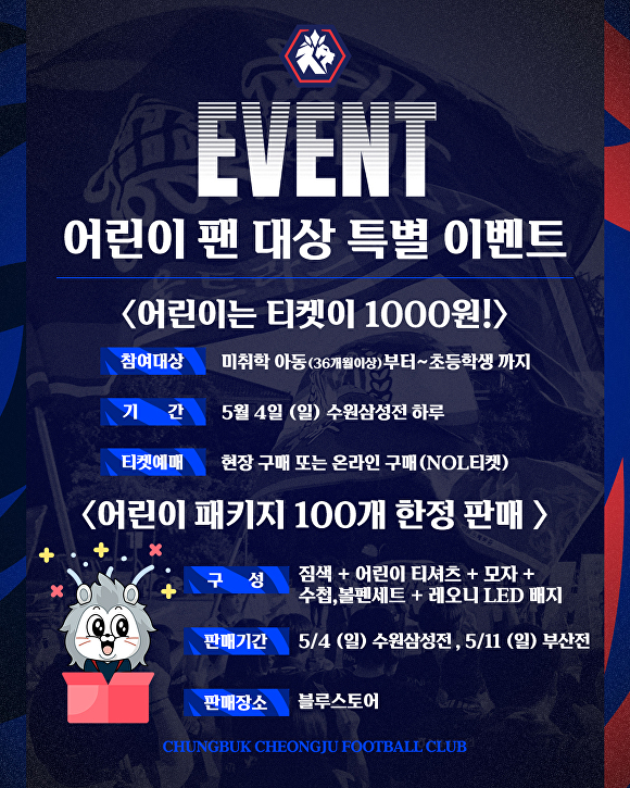 김현주 충북청주FC 대표이사는 “어린이날(5월 5일)을 맞아 아이들에게 축구장의 추억을 선물해주고 싶었다”며 “이번 이벤트로 많은 어린이가 구단과 가까워지길 바란다”고 전했다.