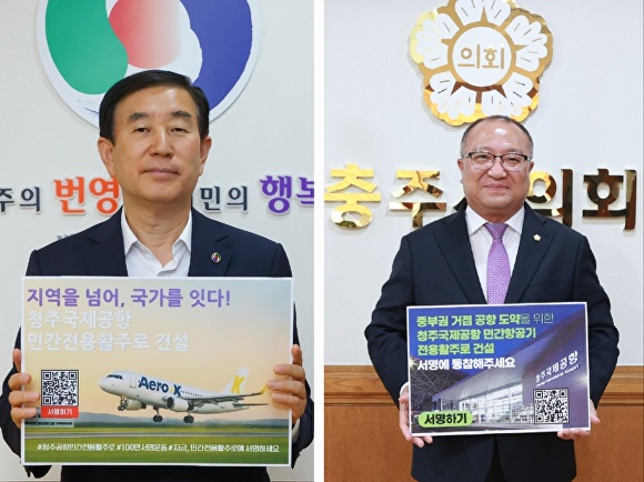 [아이뉴스24 윤재원 기자] 조길형 충북 충주시장과 김낙우 충주시의회 의장이 청주국제공항 민간 전용 활주로 건설을 촉구하는 릴레이 캠페인에 동참했다.