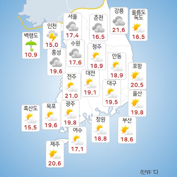 부산지방기상청에 따르면 이날 오전 9시 현재 주요 지역의 기온은 부산 18.6도, 울산 19.8도, 창원 18.8도로 기록됐다.