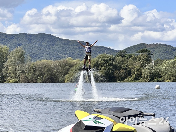 의성 율정호수상레저센터에서 관광객이 프라이보드를 체험하고있다. [사진=의성군]