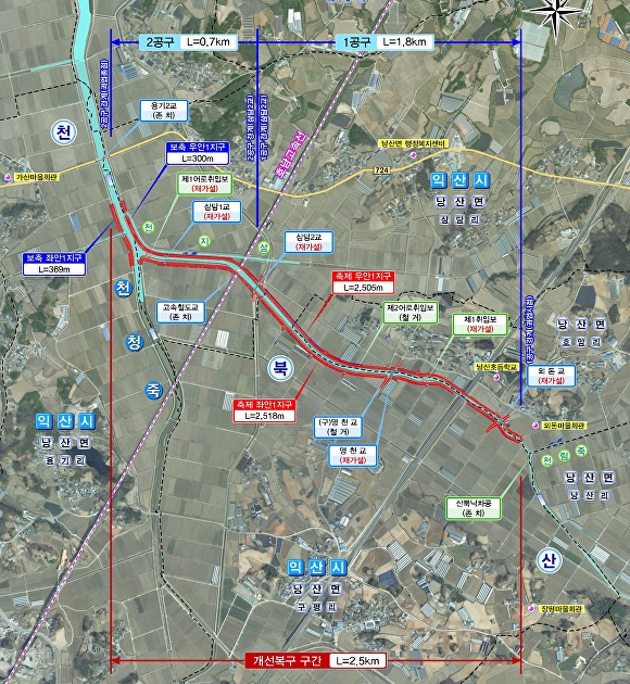 공사 구간은 낭산면 구평리 1760번지에서 삼담리 죽청천 합류점까지 총 2.5km로 △제방 보강(5,796m) △교량 재가설(4개소) △기존 교량 철거(1개소) 등 구조적인 개선이 이뤄질 예정이다.