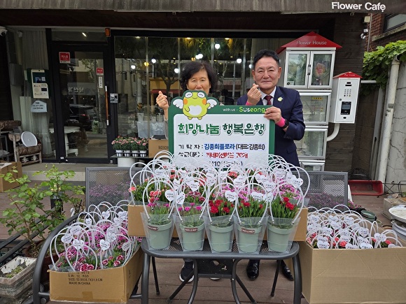 이날 김종희 대표는 110만원 상당의 카네이션 화분 70개를 수성구 범어3동, 범어4동, 만촌1동, 범물1동 행정복지센터에 기탁했다. 기탁된 화분은 각 동의 저소득층 어르신들에게 전달돼 감사와 위로의 마음을 전할 예정이다.