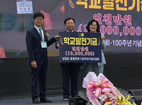 지난 10일 남일초 운동장에서 열린 개교 100주년 기념식에는 동문과 지역 인사, 학생, 학부모 등 1000여명이 참석했다.