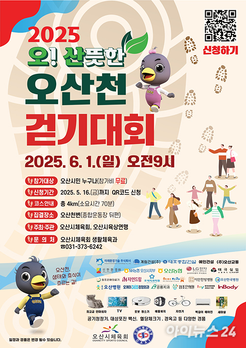 [아이뉴스24 김장중 기자] 경기도 오산시는 다음달 1일 오산천 일원에서 열리는 ‘2025 오산뜻한 오산천 걷기대회’에 2800명이 넘는 참가 신청으로 조기 마감됐다고 밝혔다.