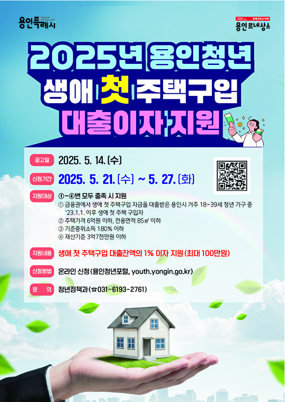 [아이뉴스24 정재수 기자] 경기도 용인특례시는 생애 첫 주택구입 자금 대출을 받은 지역 내 청년을 대상으로 ‘2025년 청년 생애 첫 주택구입 대출이자 지원사업’을 시행한다고 14일 밝혔다.