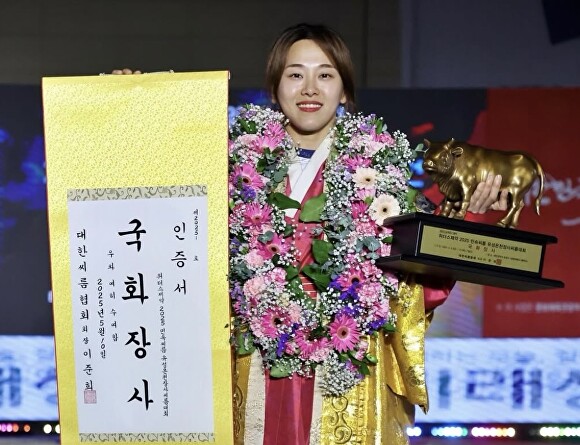 [아이뉴스24 윤재원 기자] 충북 영동군청 여자씨름단 박민지 선수가 대전 유성온천장사씨름대회에서 국화 장사에 올랐다.