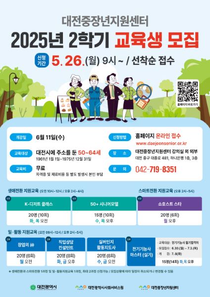[아이뉴스24 강일 기자] 대전시사회서비스원 소속 대전중장년지원센터는 중장년 세대의 인생 2막을 위한 2025년 2학기 교육과정을 개설하고, 26일부터 28일까지 수강생을 모집한다.