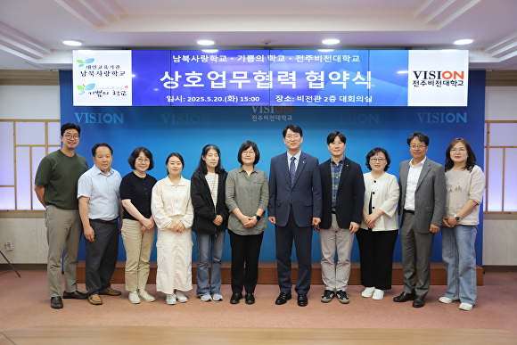 전주비전대학교(총장 우병훈)는 지난 20일, 남북사랑학교·기쁨의학교 등과 전인교육 실현과 인재 양성을 위한 업무협약(MOU)을 체결했다.