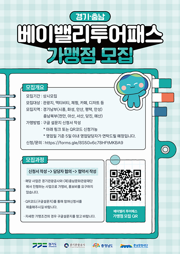 [아이뉴스24 김정수 기자] 경기관광공사는 경기투어패스와 유사한 '베이밸리 투어패스' 사업 추진에 앞서 이용객 증대와 만족도 제고 차원에서 경기 남부의 5개 시에 가맹점을 상시 모집 중이라고 21일 밝혔다.