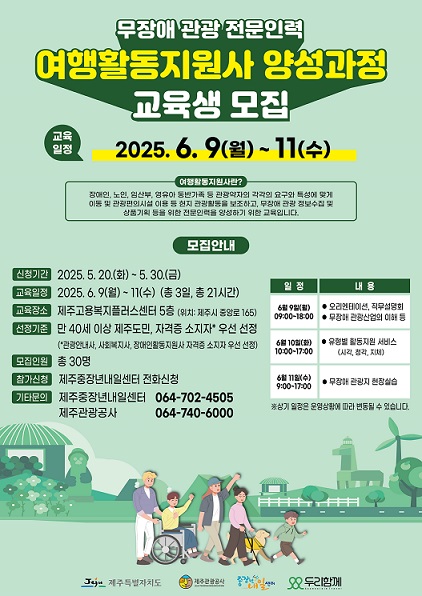 [아이뉴스24 배정화 기자] 제주특별자치도와 제주관광공사(사장 고승철)는 ‘모두를 위한 열린 관광’을 실현하기 위한 무장애 관광 전문인력 양성과정 참가자를 오는 30일까지 모집한다고 21일 밝혔다. 오는 2026년 제주에서 열리는 제107회 전국체육대회 및 제46회 전국장애인체육대회의 성공적인 개최 일환이다.