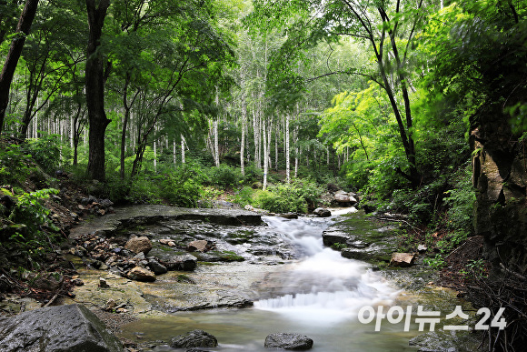 [아이뉴스24 김은경 기자] 경북 영양군 수비면 죽파리에 위치한 자작나무숲이 하얀 나무줄기와 초록 잎이 어우러진 풍경으로 여름철 피서지로 주목받고 있다.
