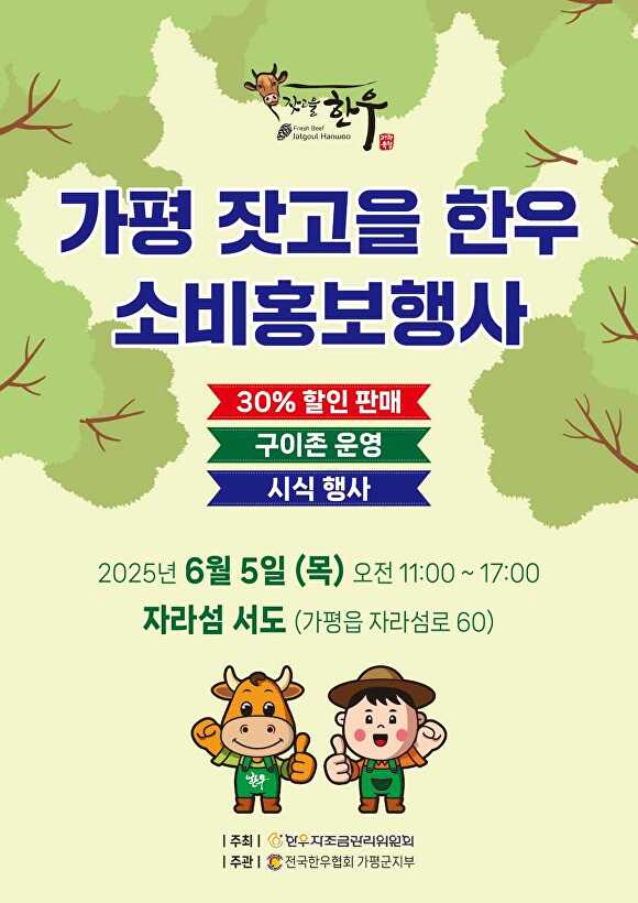 한우자조금관리위원회와 가평한우연합회가 주최‧주관하는 이번 행사는 지역 한우 농가의 소득 증대·한우 소비 촉진을 위해 가평군, 한우농가, 관련 단체 등이 함께 한다.