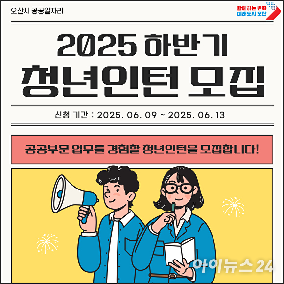 [아이뉴스24 김장중 기자] 경기도 오산시가 오는 7월부터 시행하는 ‘2025년 하반기 청년인턴사업’ 참여자를 공개 모집한다.