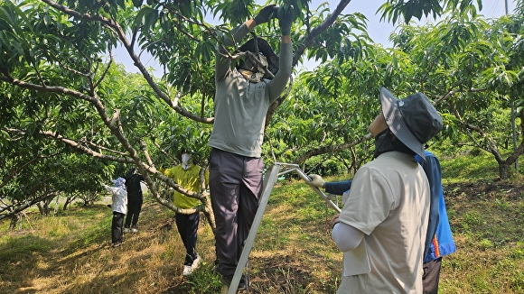 이날 참여한 봉사자들은 복숭아 적과와 봉지씌우기 작업에 나섰다. '적과'는 열매의 품질을 높이기 위해 알찬 열매만을 선별해 남기는 작업으로 생산성과 품질 향상에 매우 중요한 단계다. '봉지씌우기'는 병해충 피해를 예방하고, 고품질의 복숭아 재배를 위한 필수 작업이다.
