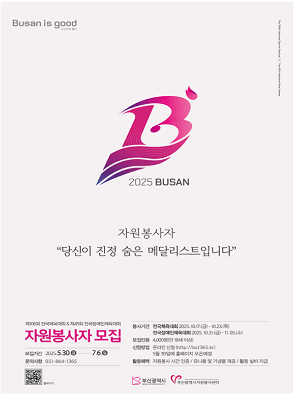 [아이뉴스24 정예진 기자] 부산광역시가 오는 30일부터 7월 6일까지 제106회 전국체전 및 제45회 전국장애인체전 자원봉사자를 모집한다.
