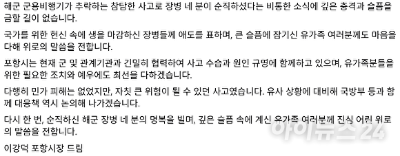 끝으로 이강덕 시장은 "순직하신 해군 장병 네 분의 명복을 다시 한 번 진심으로 빌며, 깊은 슬픔 속에 계신 유가족께 위로의 말씀을 드린다"고 전했다.