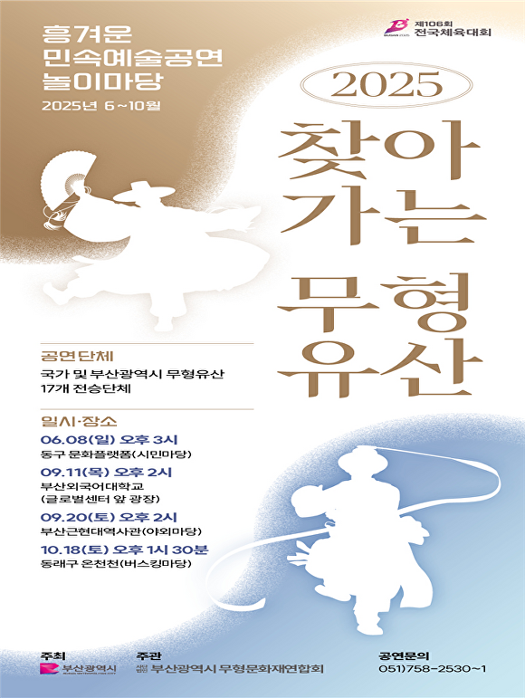 [아이뉴스24 정예진 기자] 부산광역시가 지역 무형유산의 가치를 확산하고 시민 문화 향유 기회를 넓히기 위해 ‘2025 찾아가는 무형유산’ 전통민속예술공연을 개최한다.