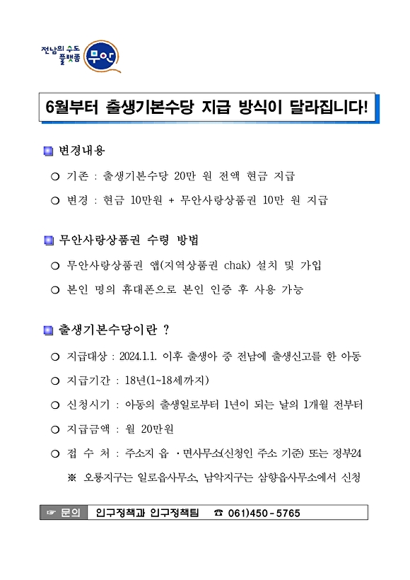 군은 이달부터 출생기본수당을 기존 현금 20만원에서 ‘현금 10만원+무안사랑상품권 10만원’으로 변경 지급해 출산가정을 지원함과 동시에 지역경제 활성화를 동시에 도모한다.