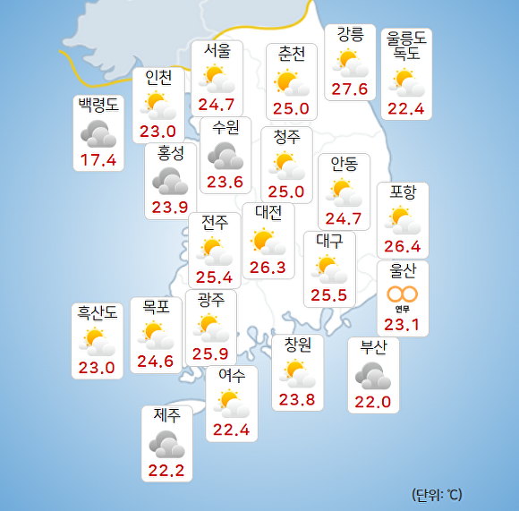 부산지방기상청에 따르면 이날 오전 10시 현재 주요 지역의 기온은 부산 22도, 울산 23.1도, 창원 23.8도로 기록됐다.