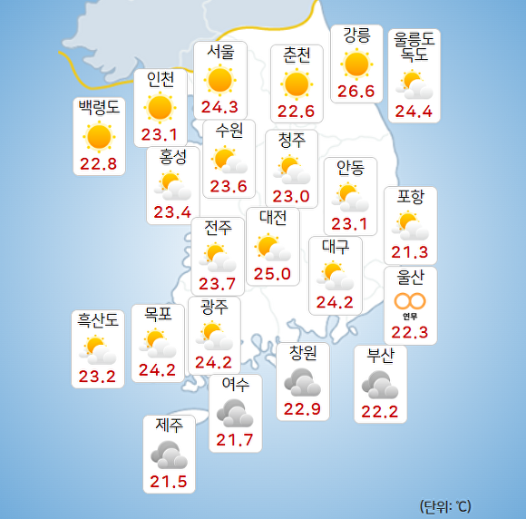 부산지방기상청에 따르면 이날 오전 9시 현재 주요 지역의 기온은 부산 22.2도, 울산 22.3도, 창원 22.9도로 기록됐다.