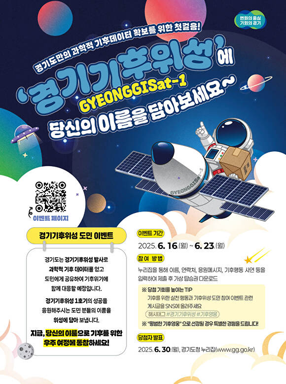 [아이뉴스24 김정수 기자] 경기도는 오는 23일까지 이벤트 신청 누리집(climate.gg.go.kr/event)을 통해 도민 참여형 특별 이벤트인 '경기기후위성 이름 각인' 참여자를 모집한다.