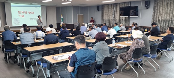 전남 함평군에서 진행된 과수탄저병 예방 교육에서 과수 재배 농민들이 방제 기술에 관한 강연을 듣고 있다. [사진=함평군]