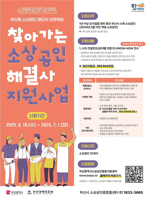 [아이뉴스24 정예진 기자] 부산광역시와 부산경제진흥원이 18일부터 내달 1일까지 ‘찾아가는 소상공인 해결사 지원사업’에 참가할 지역 요식업 소상공인 10개사를 모집한다.